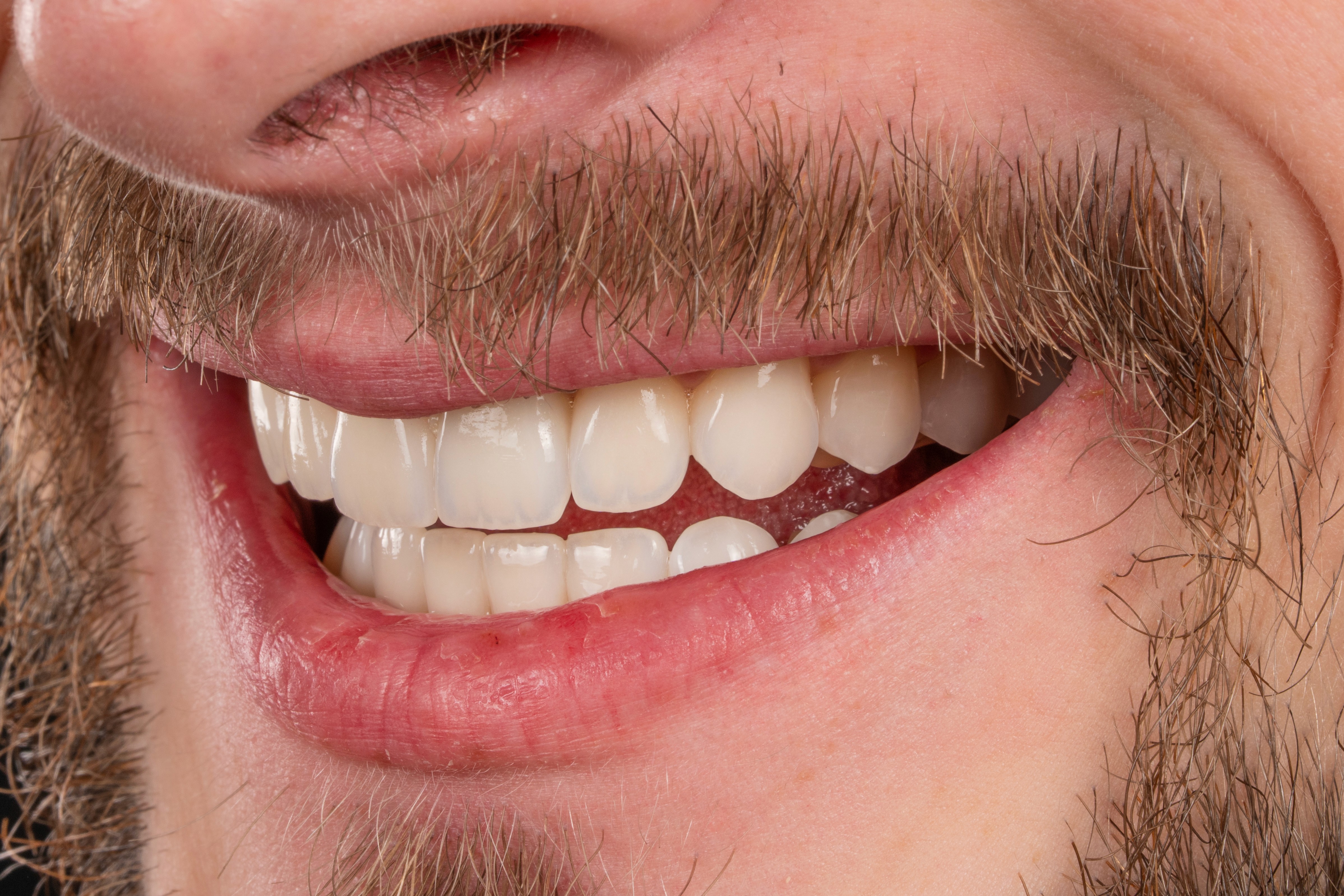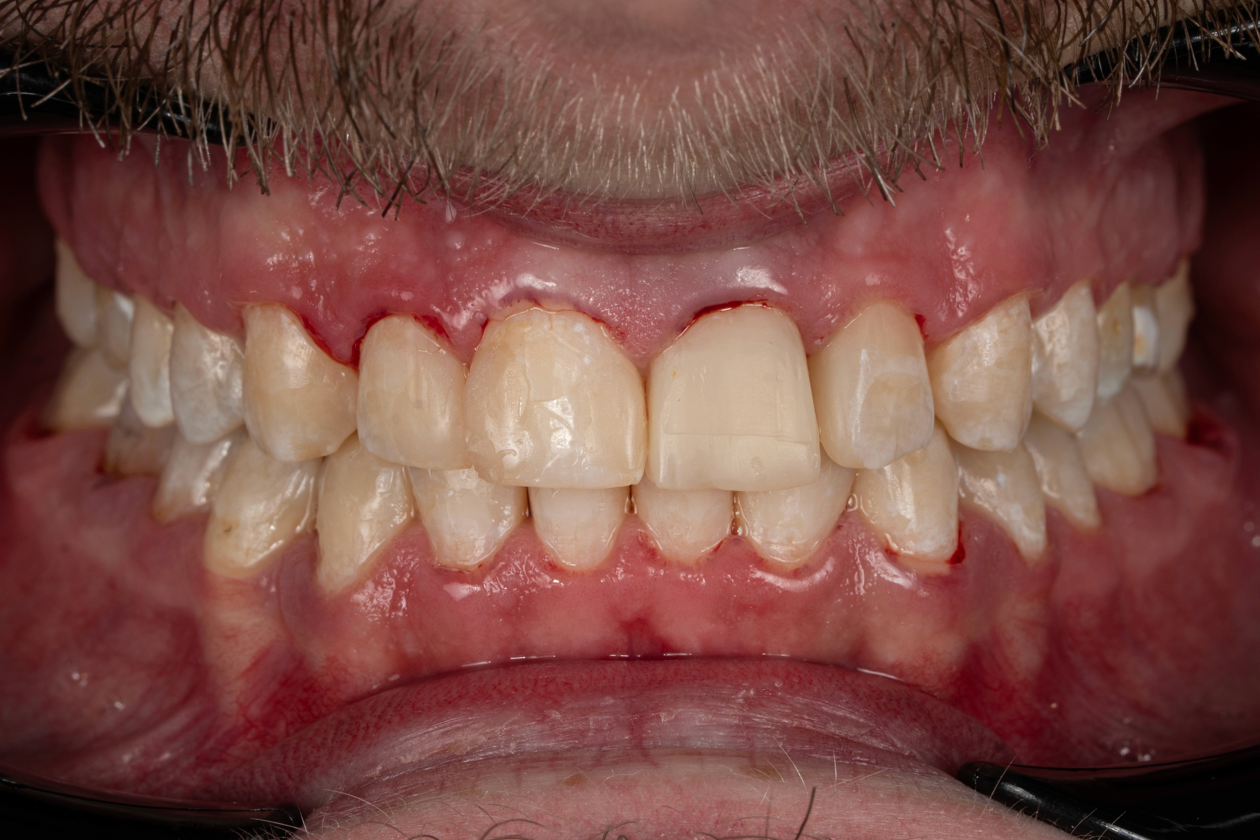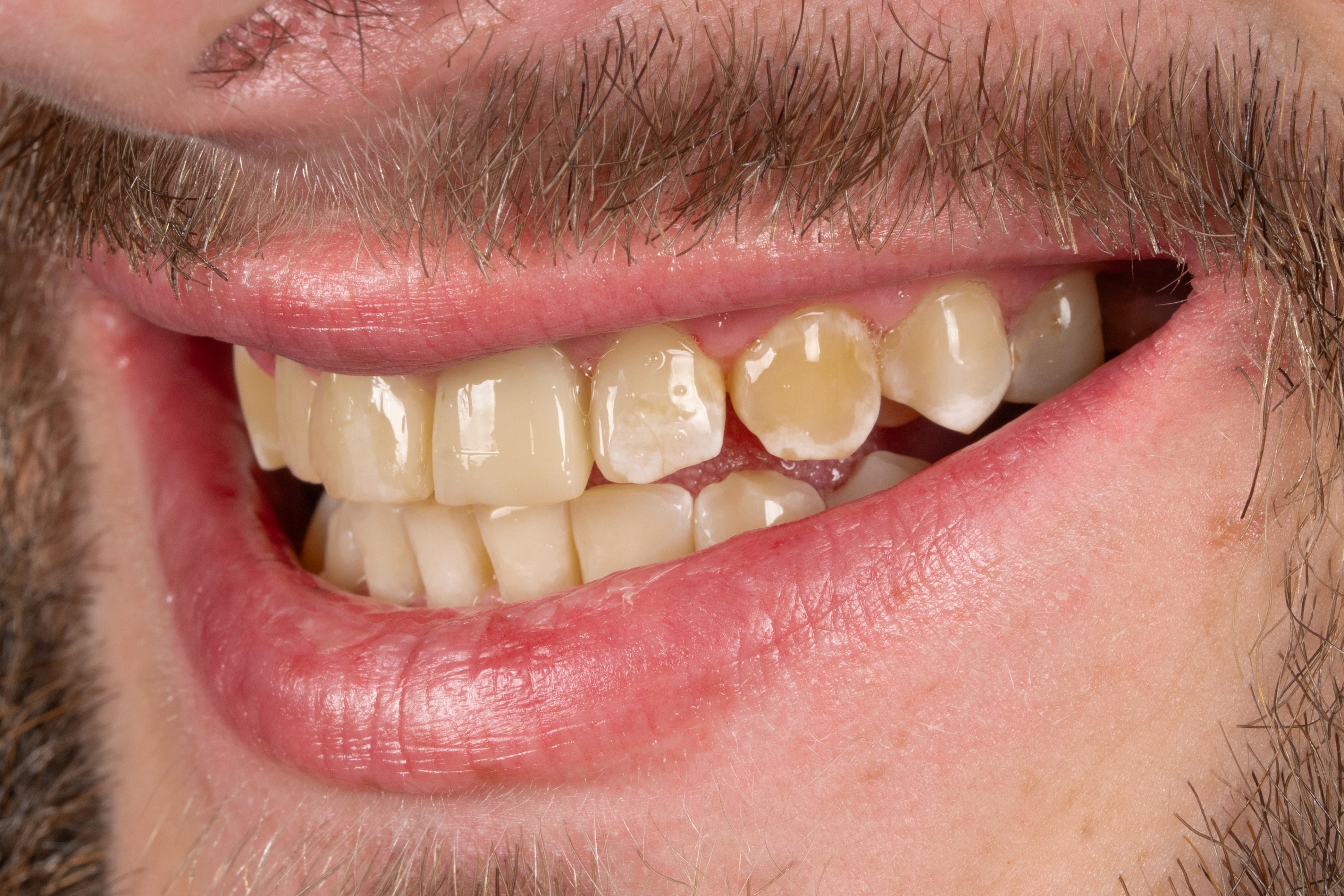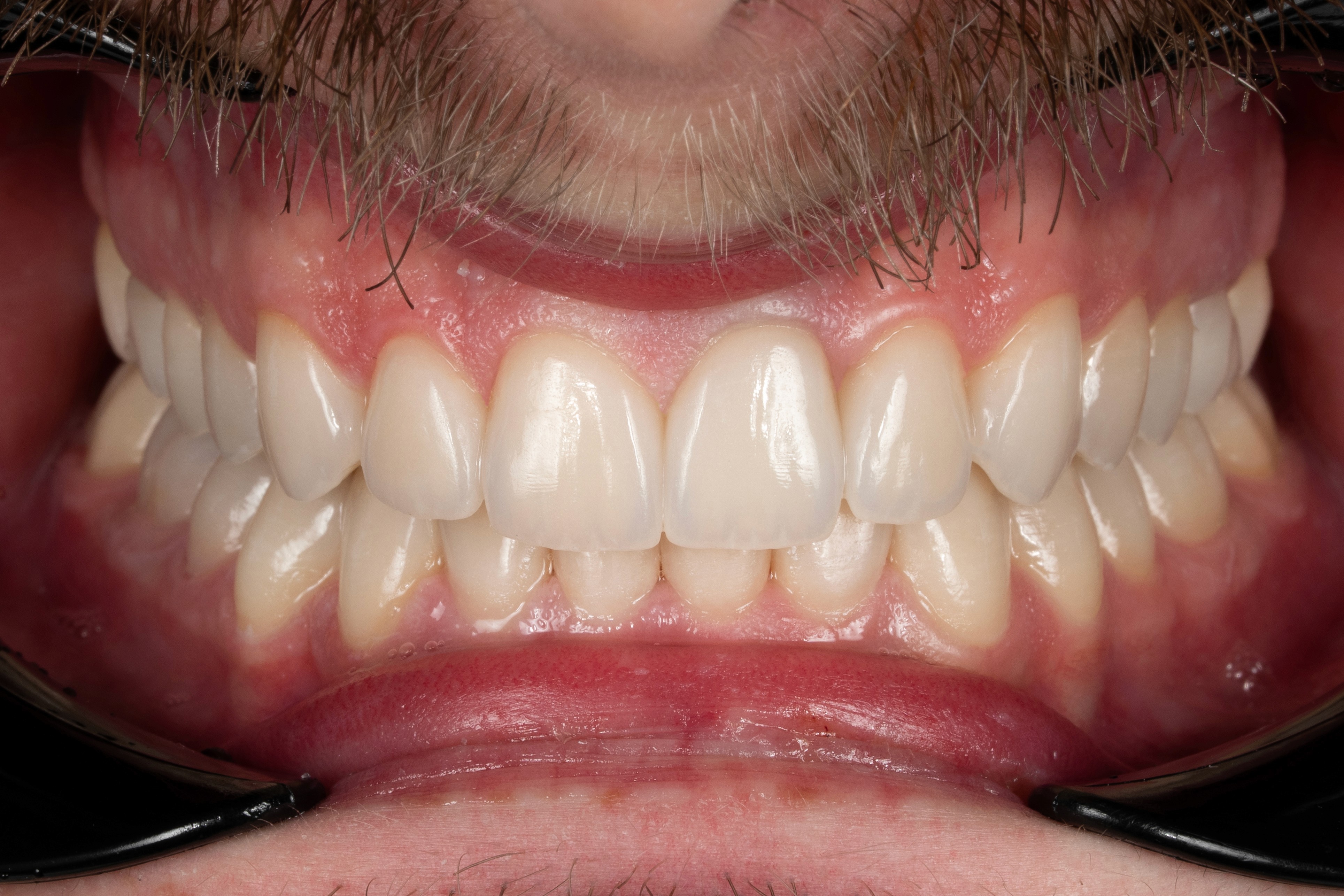 Скарги: кровоточивість ясен, застрягання їжі між зубами, постійне випадіння пломб, ламкість і кришіння зубів. Причина: травматична оклюзія — неправильне змикання зубів, що призводило до перевантаження і руйнування зубів. Підготовка: повна санація — переліковані канали, лікування карієсу, професійна гігієна. Лікування: ортодонтичне лікування — брекет-система протягом 2 років для повного вирівнювання прикусу; після цього тотальне відновлення зубів керамічними реставраціями (вініри та коронки). Реабілітація: близько 1 місяця для адаптації, стабілізації прикусу та корекції оклюзійних контактів. Результат: стабілізований прикус, здорові ясна, повністю відновлена функція зубів та природна естетика усмішки.